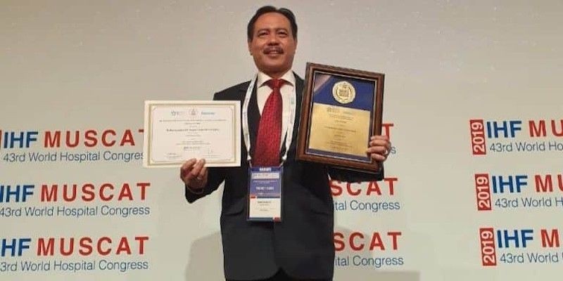 DIREKTUR RSUD dr Iskak Tulungagung, dr Supriyanto SpB saat meraih medali emas rumah sakit terbaik di dunia di ajang IHF Award 2019. -Humas RSUD Tulungagung-